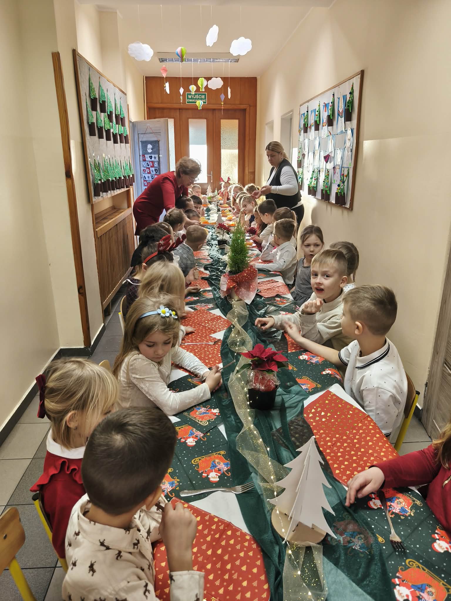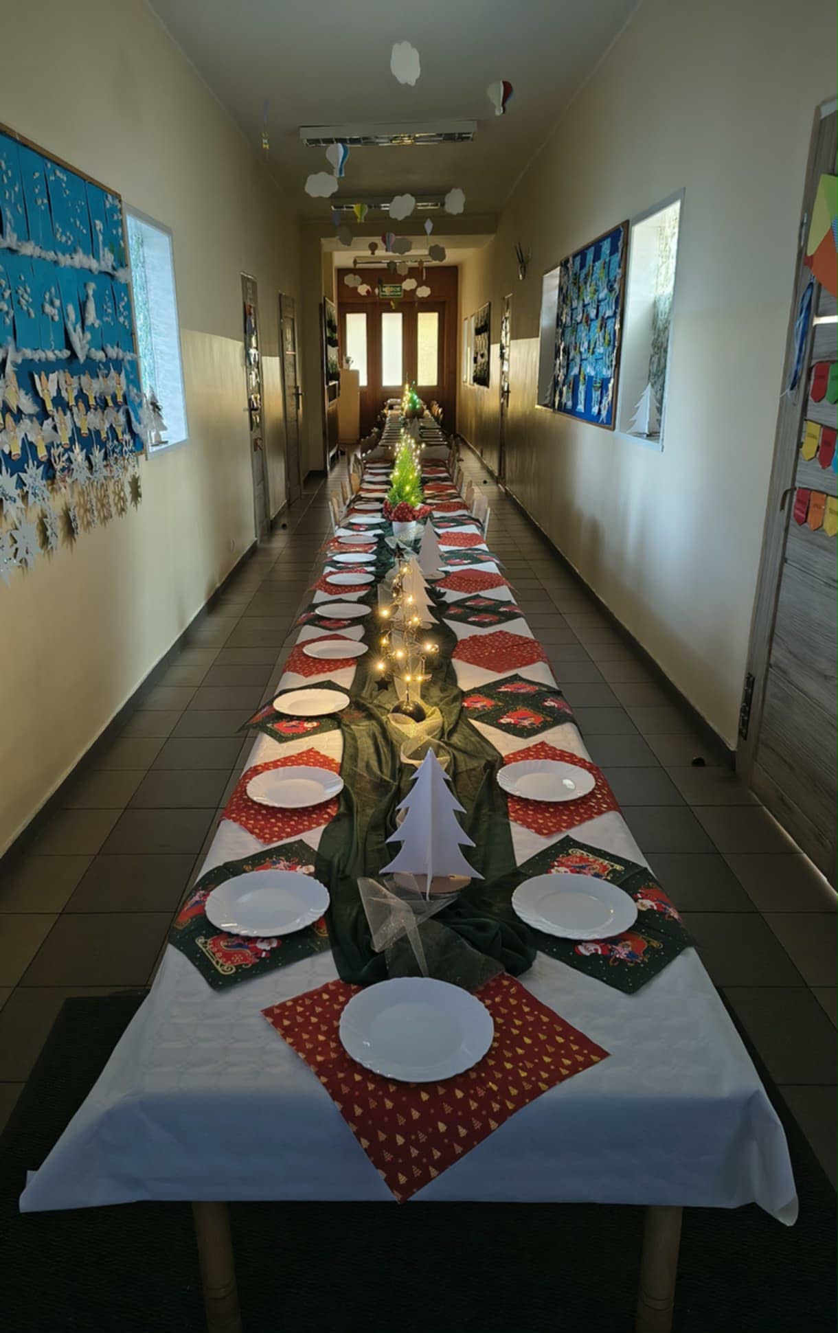 Dzieci wraz z wychowawcami zasiadły przy długim, pięknie przygotowanym stole, na którym znalazło się sianko pod obrusem – symbol wigilijnej tradycji. Nie zabrakło też wolnego miejsca dla wędrowca, przypominającego nam o otwartości i gościnności, które są tak ważne w czasie Świąt Bożego Narodzenia.